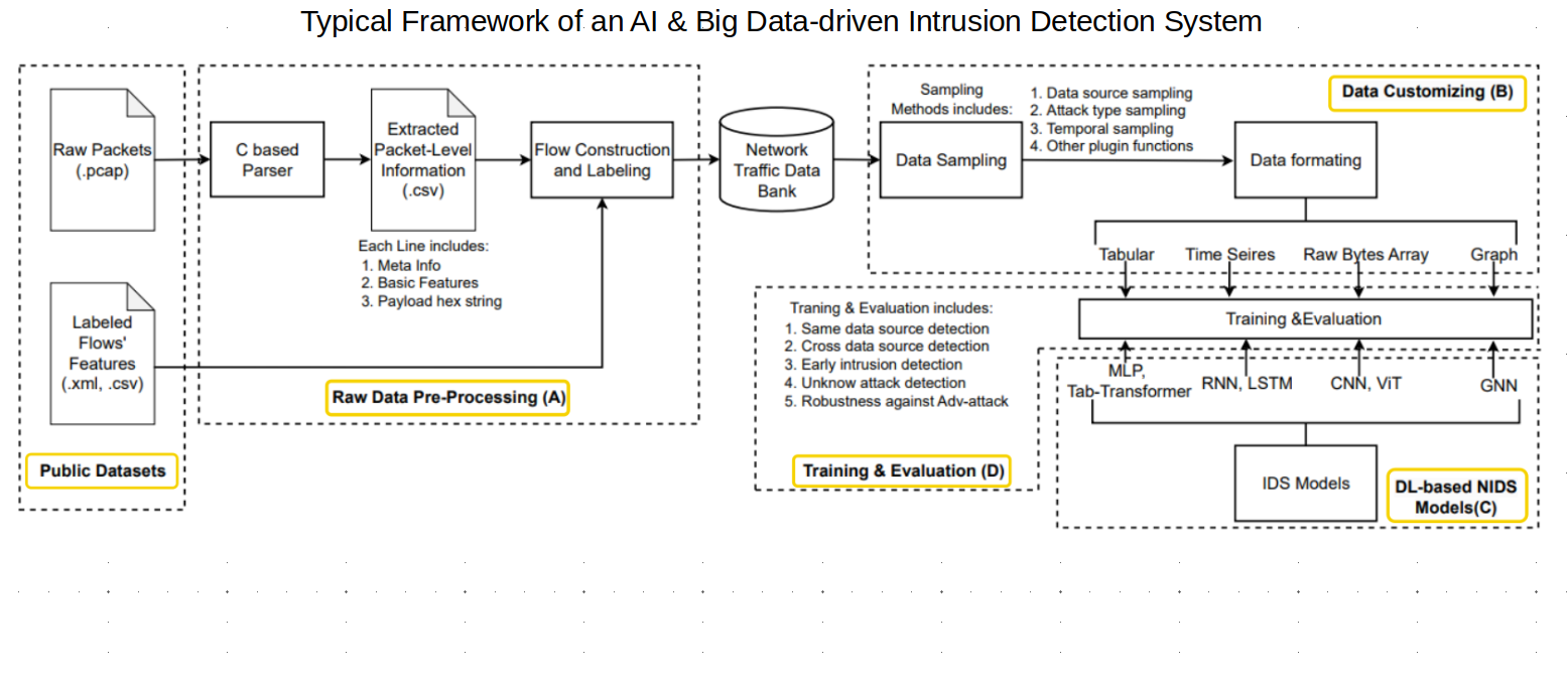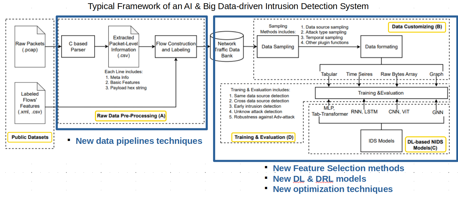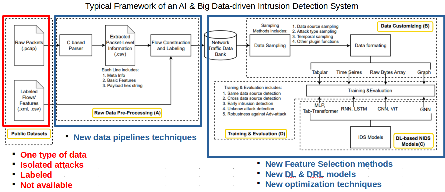 - The following picture is modified from the original to describe the most relevant stages regarding how researchers propose or improve new technologies for IDS. We just added dotted-line-boxes and add some labels for a better depiction of the stages.