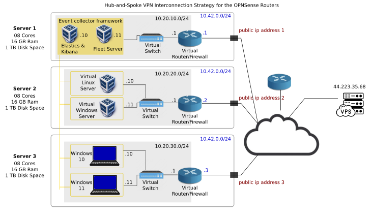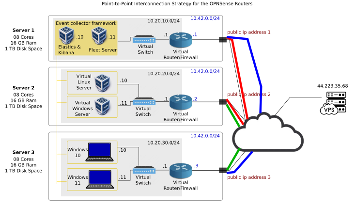 So, we will have our lab network distributed in three different servers. Each of the servers, has a public IP Address. So, from my criteria, I see two practical options to connect the three networks: