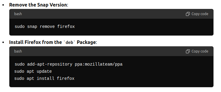 So, we uninstalled all current versions of firefox (from apt, from snap)