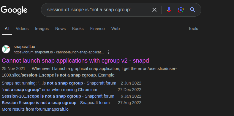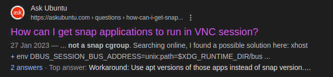 So, apparently there is this problem in which snap applications don’t run through VNC sessions, and, why not, probably any remote desktop connection