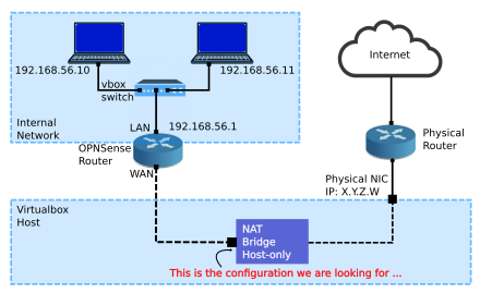 Remember that per our assumptions, our physical host (which -in this precise moment- is the same as saying the virtualbox host) gets assigned a public IP address x.y.z.w on its eno1 interface. So, it is highly likely that, on a bridge connection, the physical router won’t assign an IP address to the OPNsense router. It’s obvious it won’t happen. Just imagine if I could connect n vms in a bridge mode, all of them will be using a different IP address from the available pool that the physical router gets allowed to assign